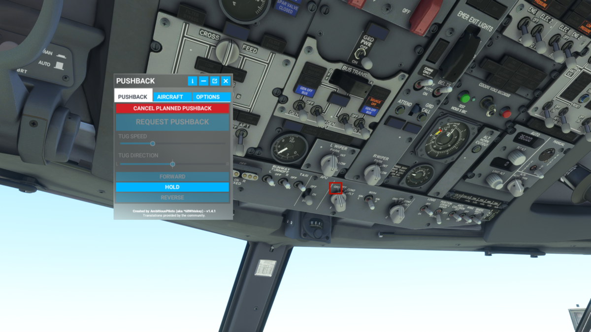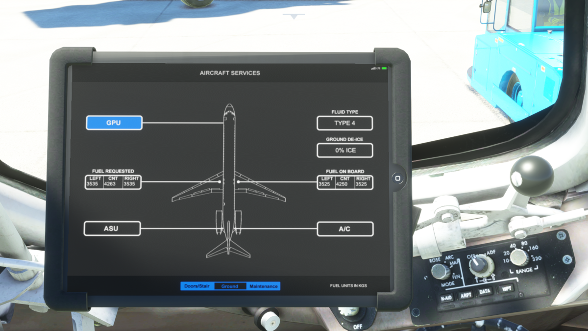 次にタブレットのホーム画面からAircraft Servicesのアイコンをクリックします。Ground->GPUをONにします。これで航空機が外部電源を使用可能になります。