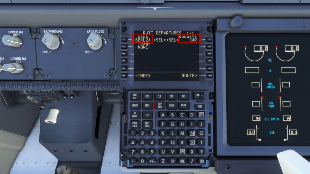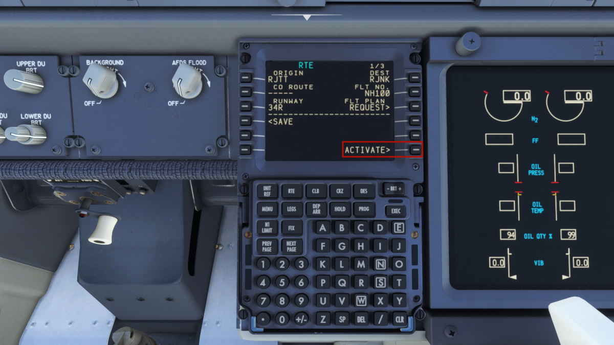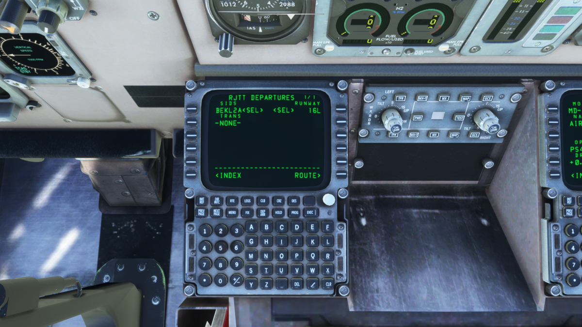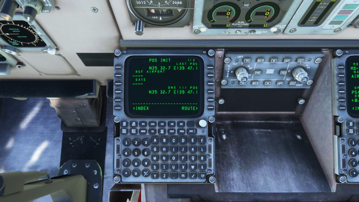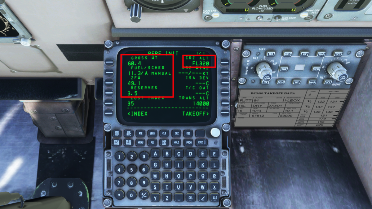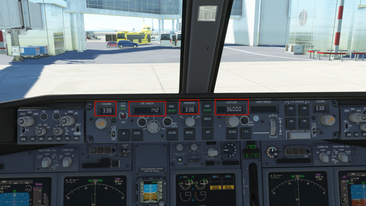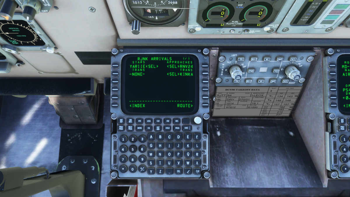 MCPの設定をしてしまいましょう。速度はV2+10で160knot(本当は決まりがあったかと思いますが適当に)、方位はRJTT 34R滑走路方位である338、高度は巡航高度である32000ft(本当はクリアランス時の承認高度だったかと思います)を入力しておきます。