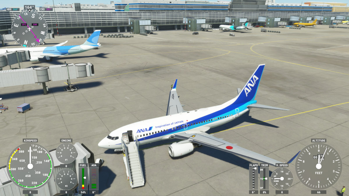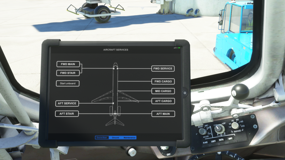 タブレット->Aircraft Services->Doors/Stairsで乗客の搭乗を開始します。意外とこれが時間かかります。