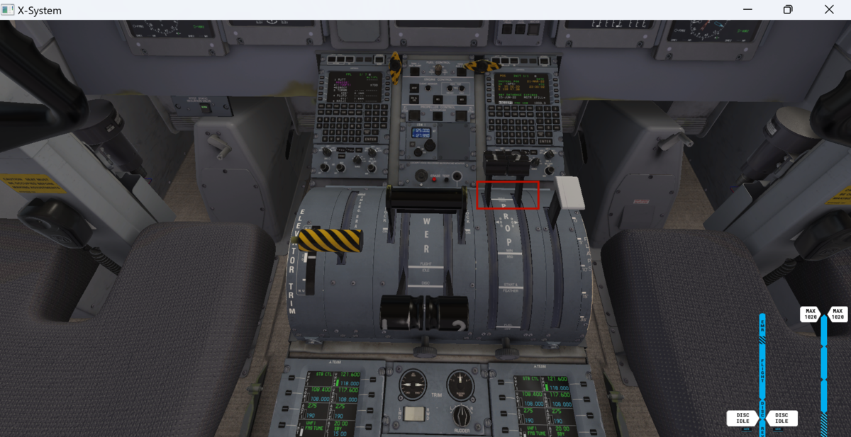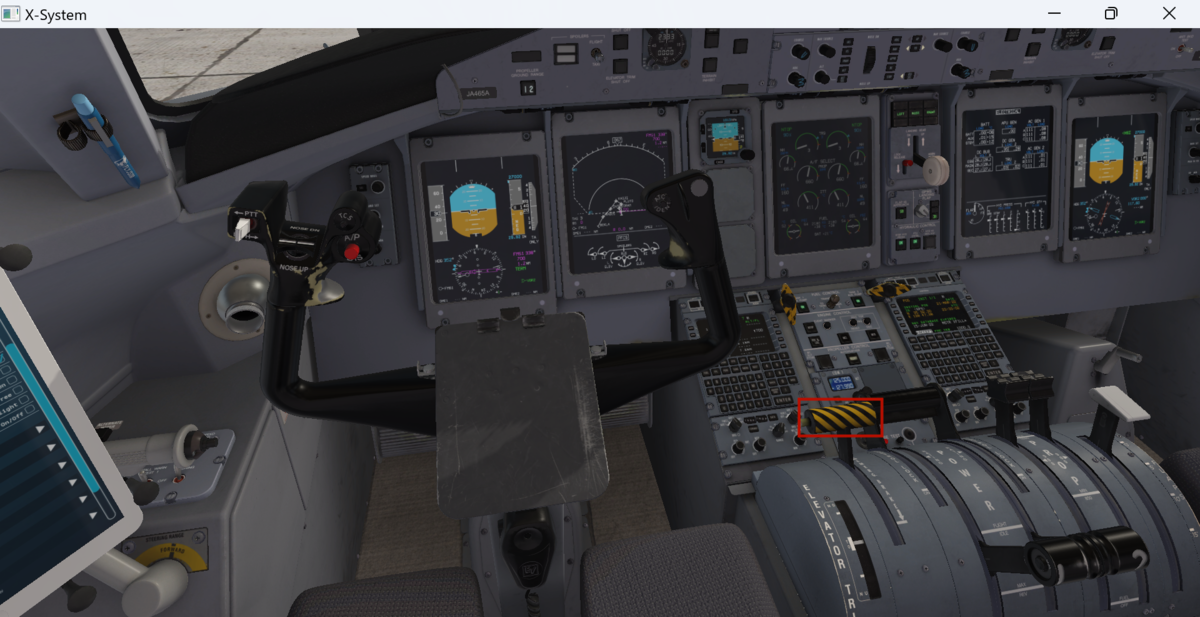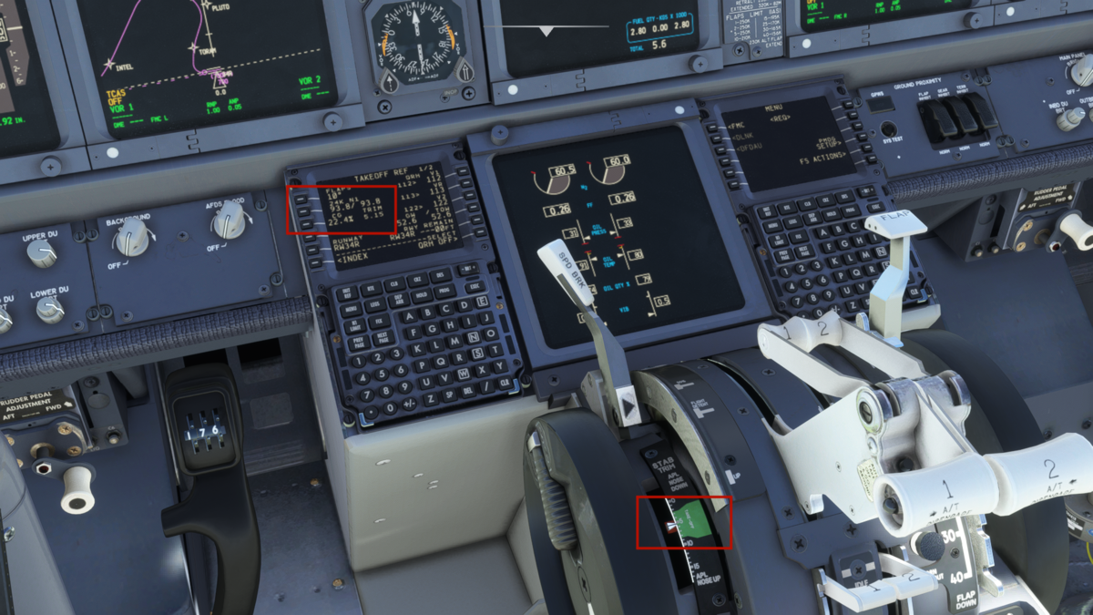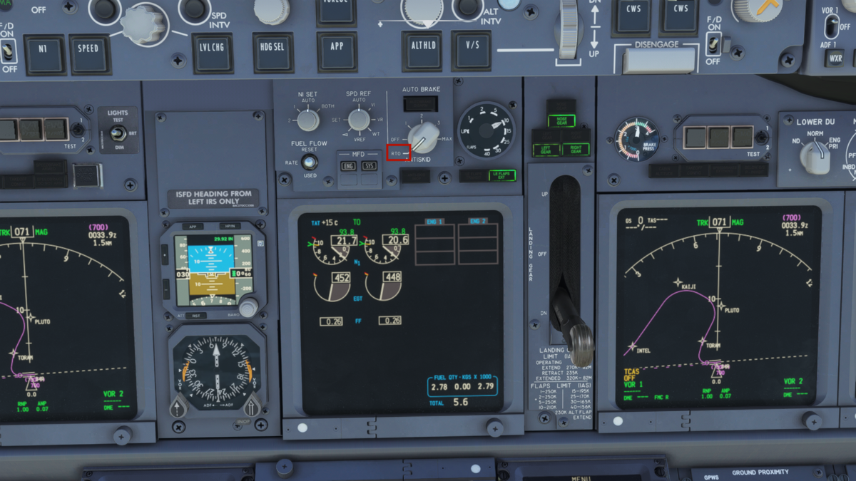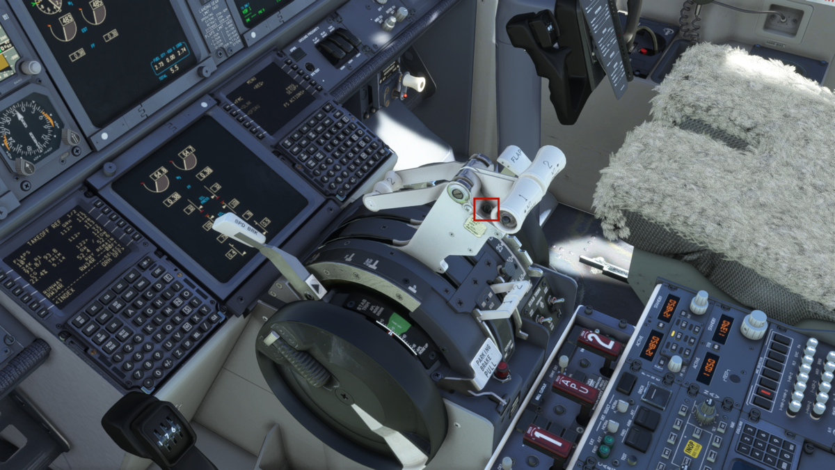 スピードブレーキをARM(真上に引き上げる)、フラップを15に設定します。画像では抜けていますが、オートブレーキはT.Oポジションにしておきます。設定ダイアルはスロットル上部にあります。