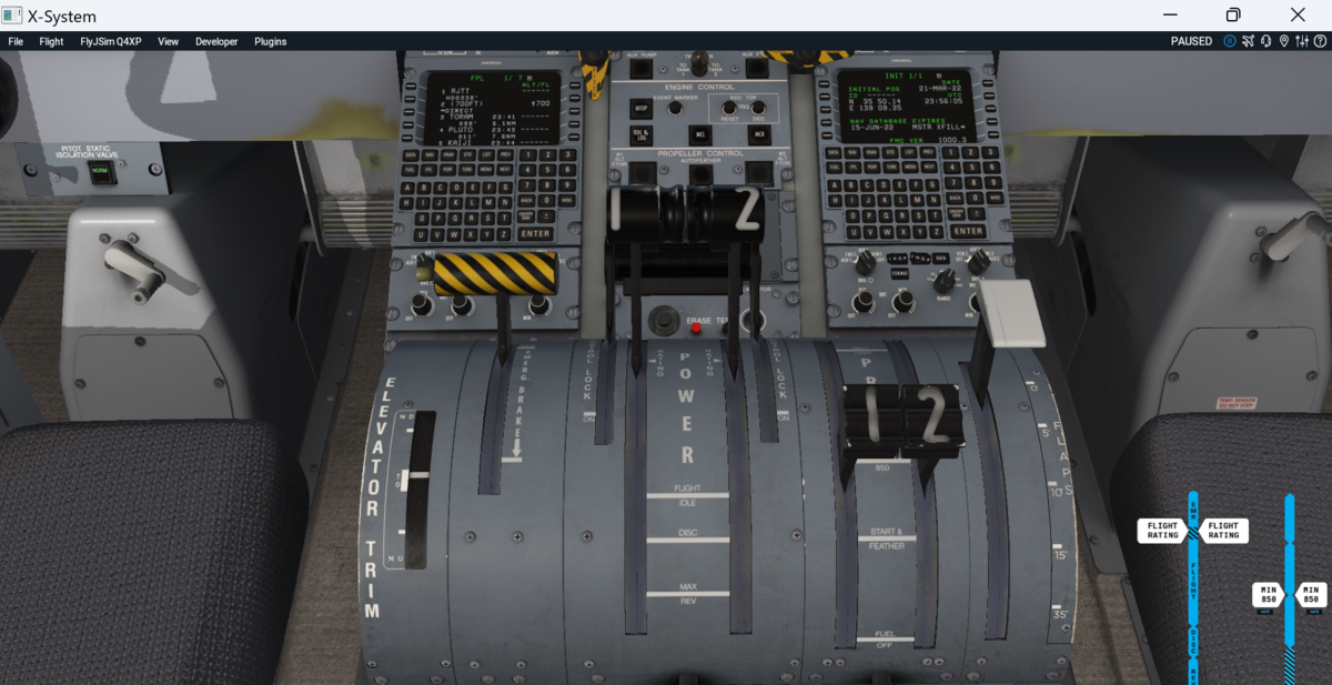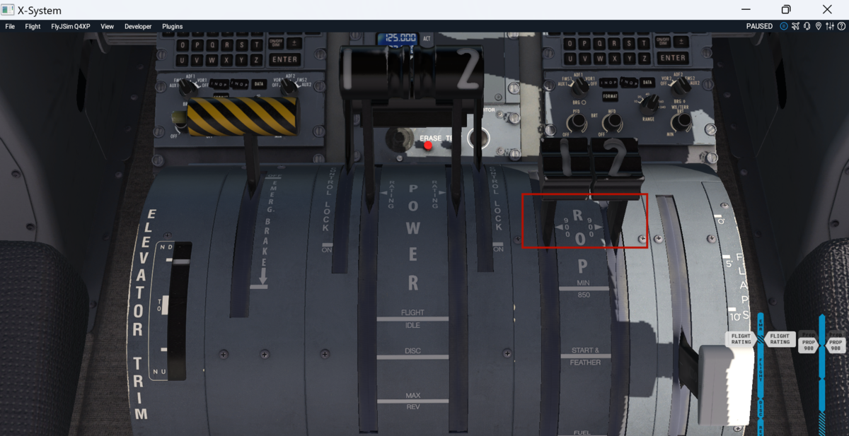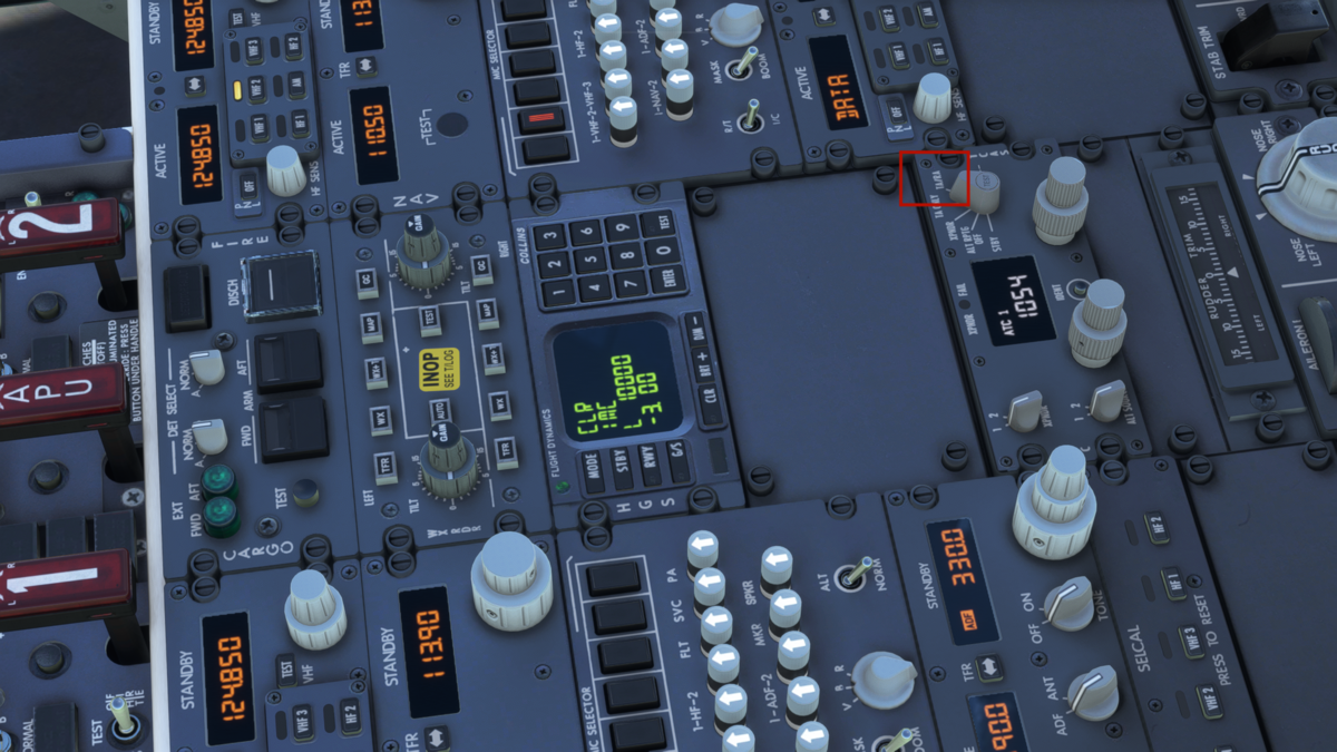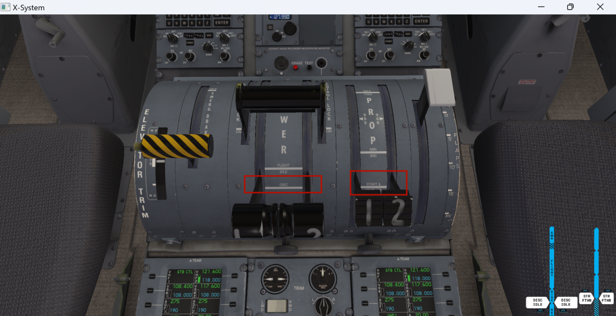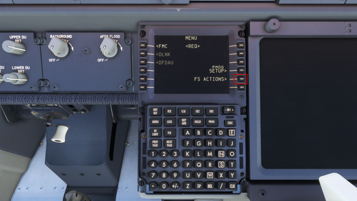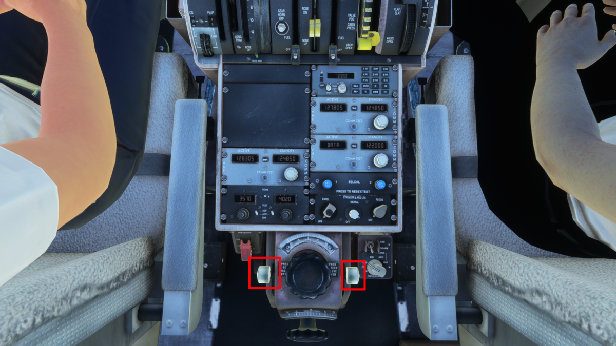 スピードブレーキをARM(真上に引き上げる)、フラップを15に設定します。画像では抜けていますが、オートブレーキはT.Oポジションにしておきます。設定ダイアルはスロットル上部にあります。