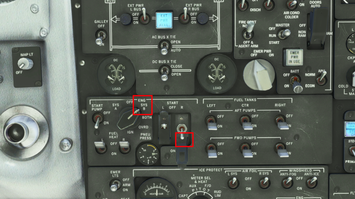 イグナイターをSYS-Bに入れて、右エンジンのスターターをONにします。