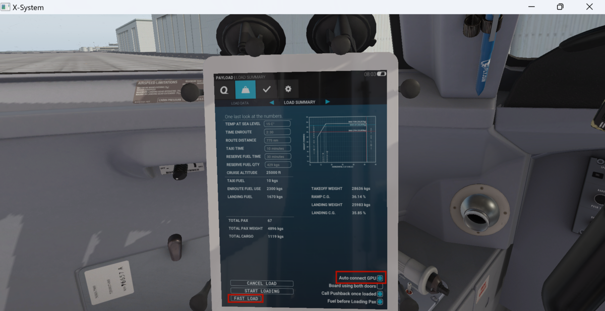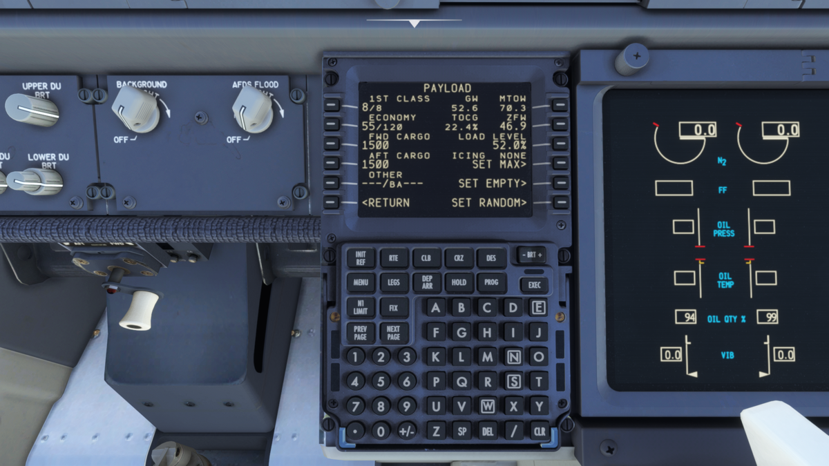 Load ManagerのページでTotal Payloadを42635KG、Block Fuelを16622KGと入力します。右の表のTO-CGが30〜31%MACに収まるようにPayload CGを調整して8.4%MACとします。