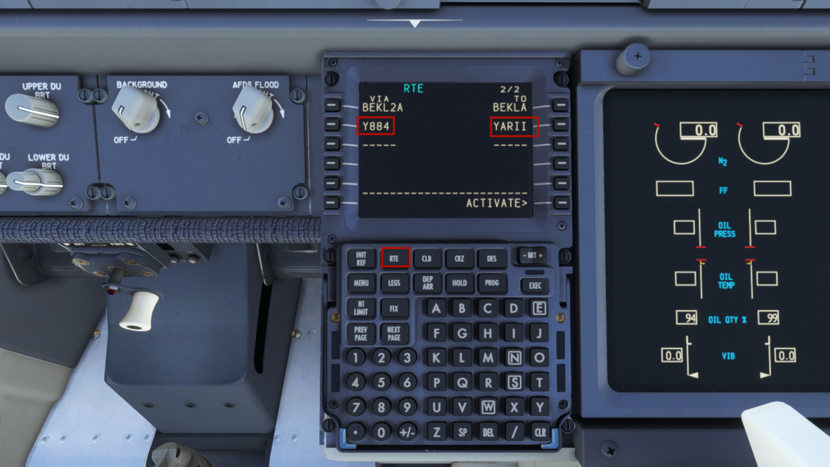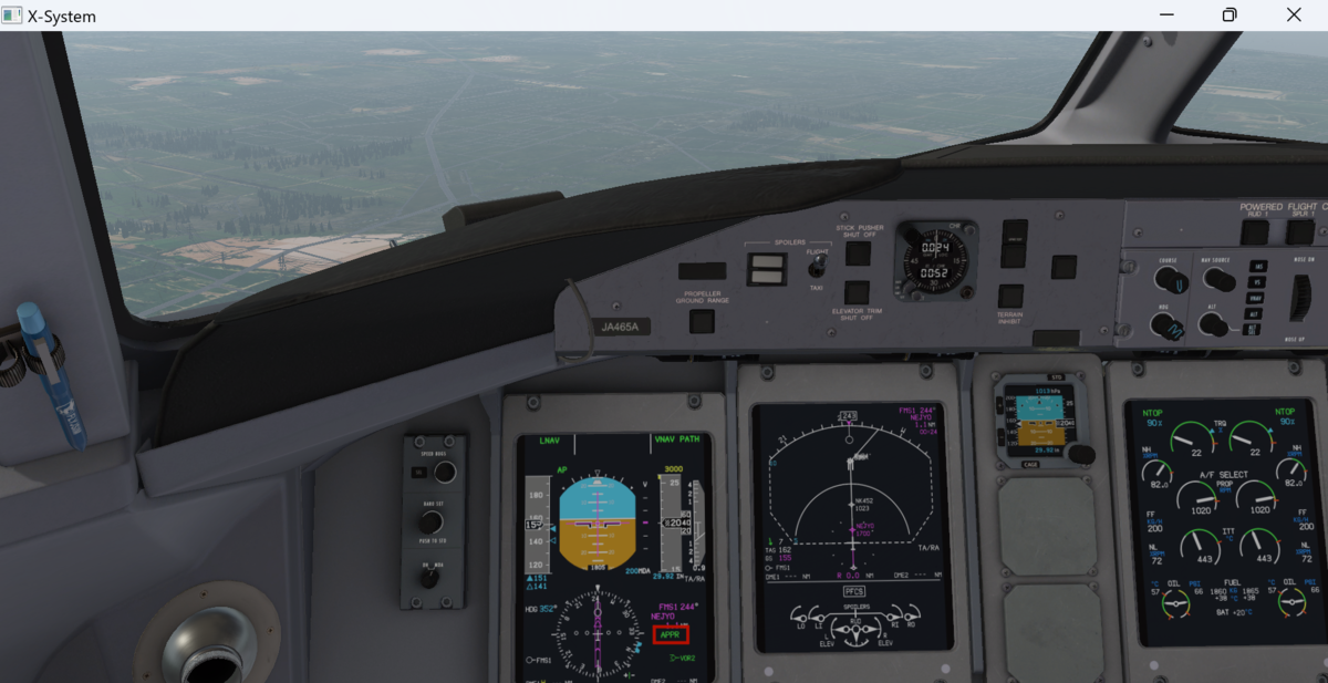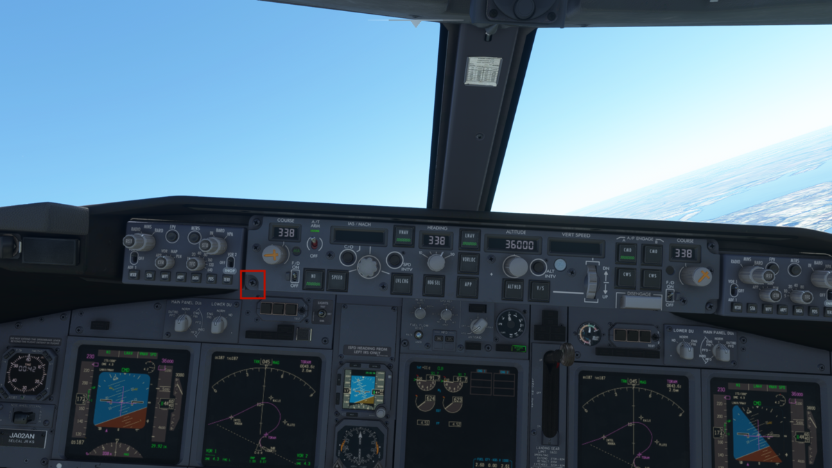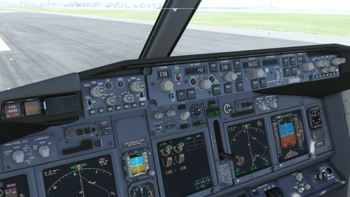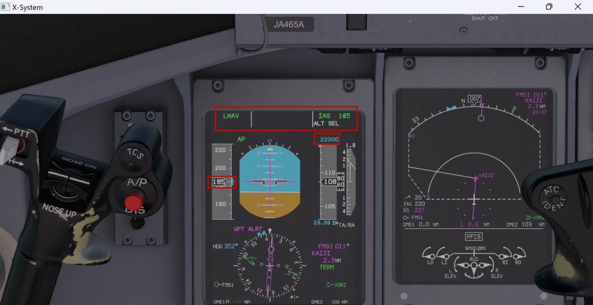 400ft以上上昇後に、NAVボタンでLNAVを、PROFでVNAVを起動します。これでオートパイロット、オートスロットルが起動しているので手を離しても大丈夫です。