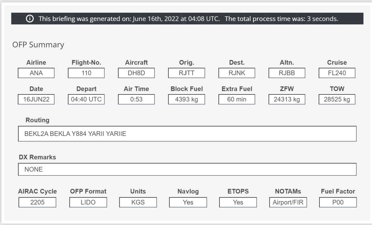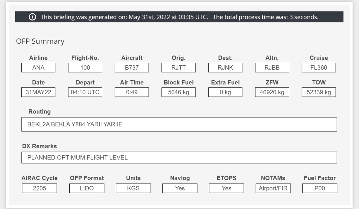 すると以下の値が求まるのでメモって置きましょう。ZFWはZero Fuel Weightといって、機体の全重量から燃料を抜いた重さ(燃料0)です。TOWはTake-Off Weightとって、離陸時の重量です。