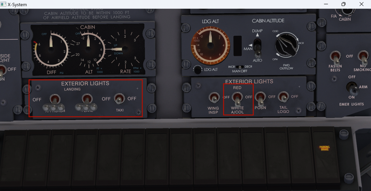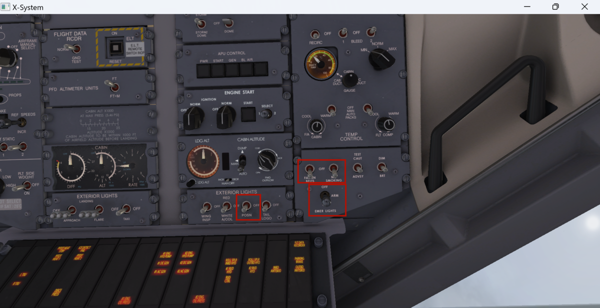 - 左下の非常灯をARMにします。ノースモーキングサイン、シートベルトサインはONにします。