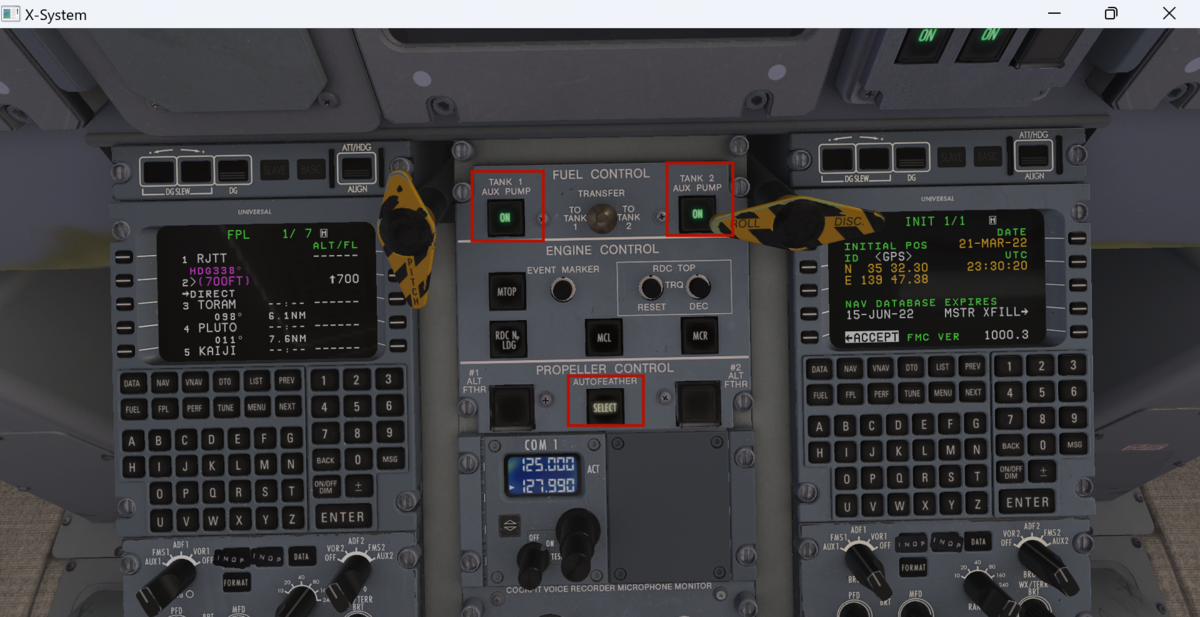 エンジンによって電源とAIRが確保できているので、APUを停止させます。まず下側でAPU BLEEDをOFFにしてから、右上でAPUをOFFにします。