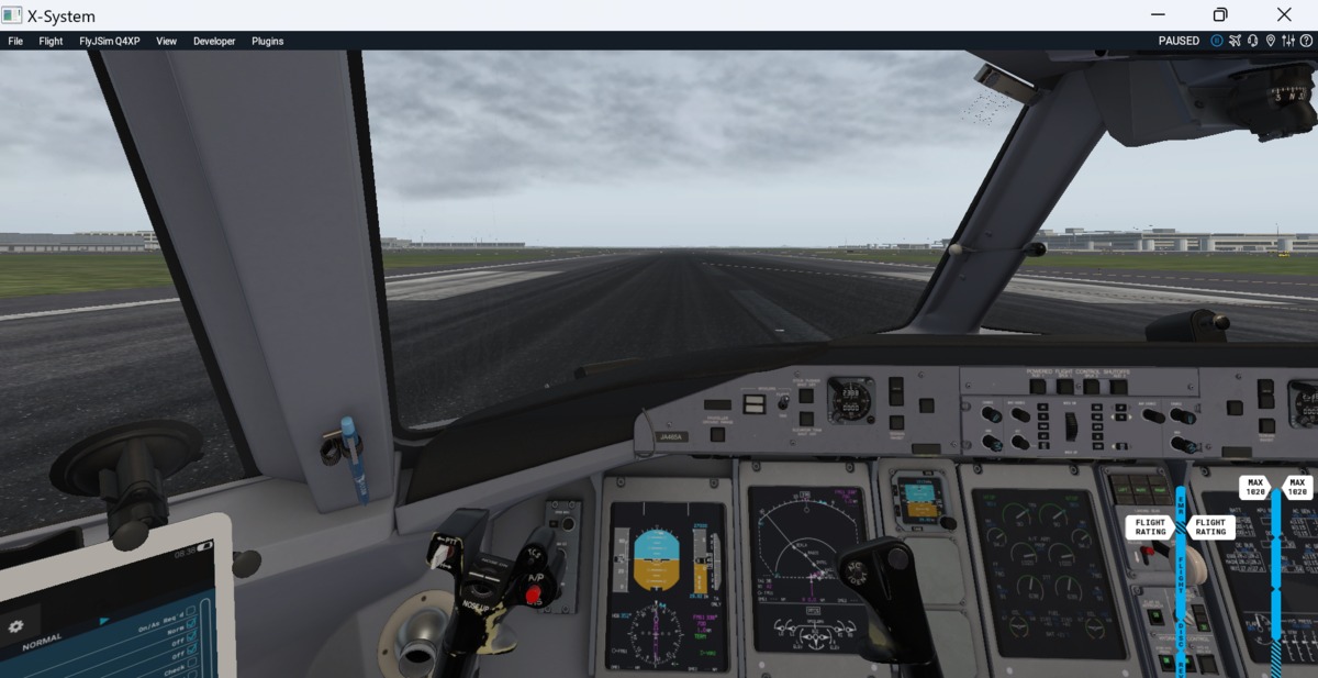 機長席右側にタブレットがあります。最初は真っ暗ですが、タブレット右端のホームボタンを長押しすると、電源ONにできます。最初に、Weight & Balanceのアイコンをクリックします。