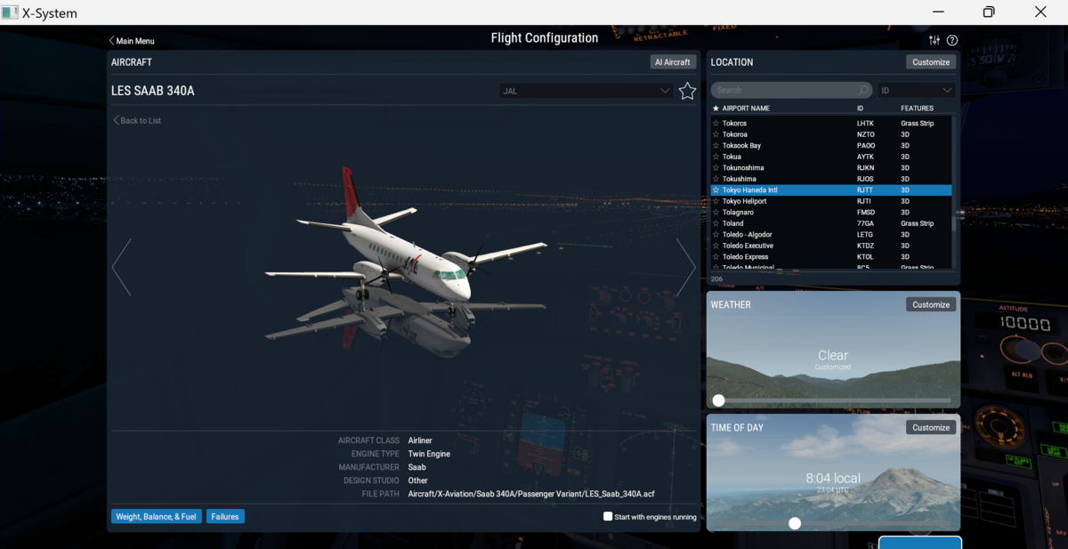 ロケーションはRJTT、機体はSaab 340Aを選択します。