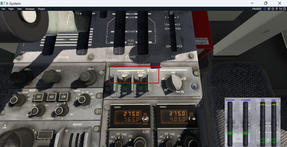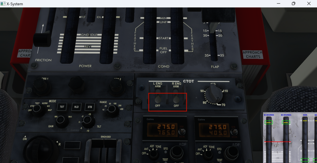 CTOTを両エンジンARMにします。CTOTはジェット機で言うReduced Thrust Takeoffのようなもので、タービン内温度ITT(Interstage Turbine Temperature)が一定値以下になるように出力を調整します。左についているノブで出力(トルク)を調整します。