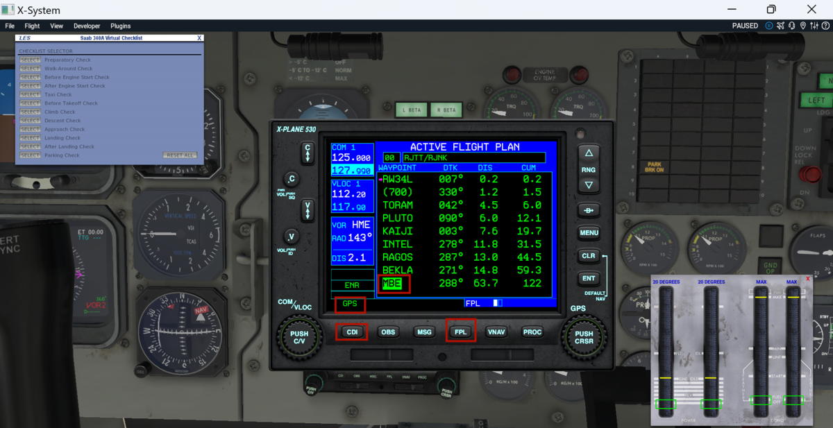 X-PlaneではGNS530を縦方向誘導(LNAV)に使用できるので、基本的にはGPS誘導で飛びます。途中のwaypointであるMBEはVORでもあるので、この区間だけVOR航法を試しにやってい見ます。(すべてGPS誘導だと味気ないので)