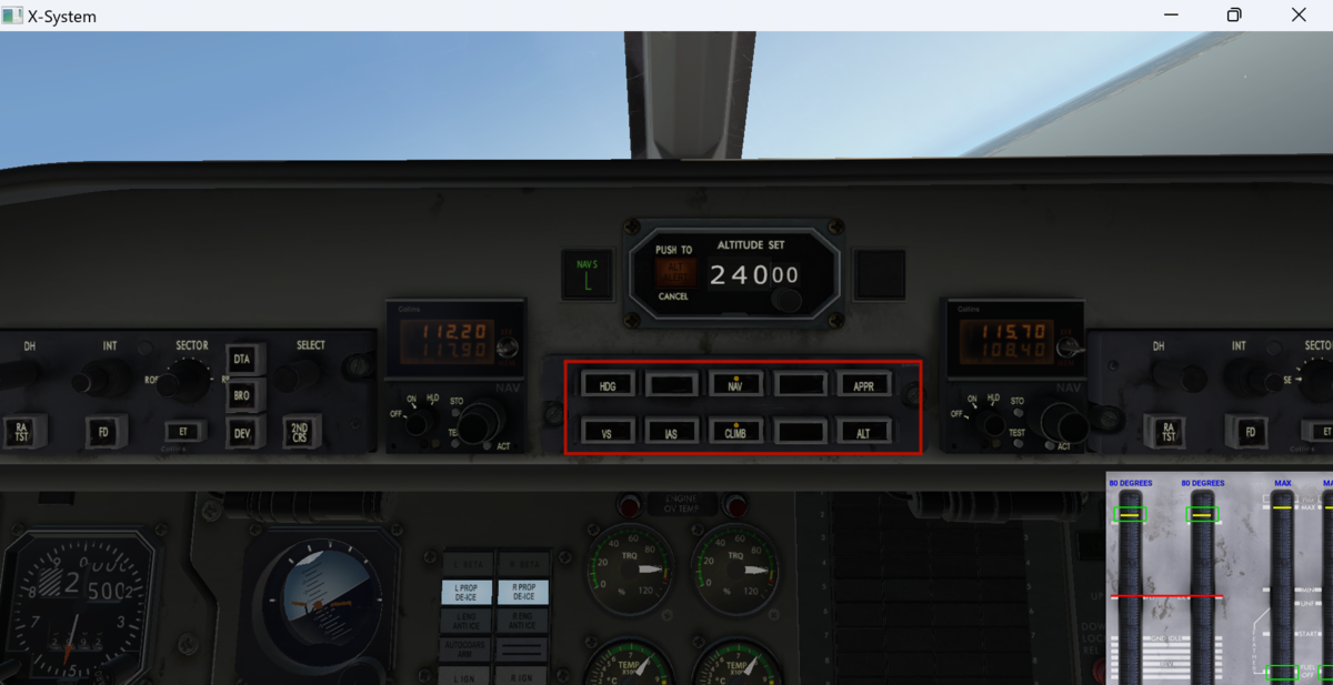 そのためIASモードを選択すると指定速度を維持するためにピッチが変化します。例えばオーバースピードの場合はピッチを上げ高度を上げることで速度を落とします。IASモードで上昇するためにはスピードバグを現在速度より下げてパワーレバーを上げると上昇します。逆に下降したい場合は、スピードバグを現在速度より上げてパワーレバーを引けば、バグで指定された速度を得るために下降し始めます。